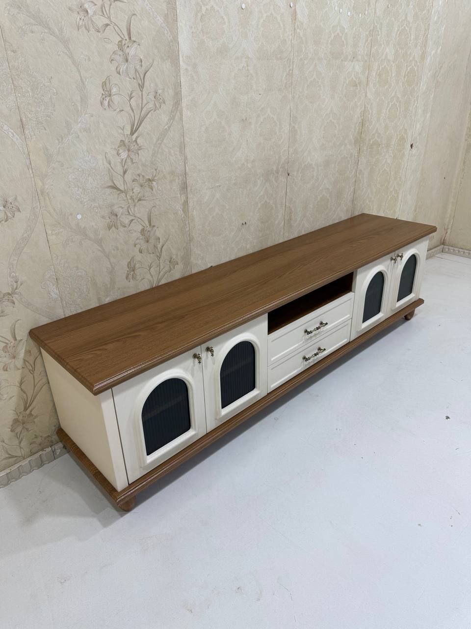 میز تلویزیون ۱۸۰ سانتیمتری کد 115 | صفحه گردویی روشن با دور کرم | پایههای چوبی طبیعی
