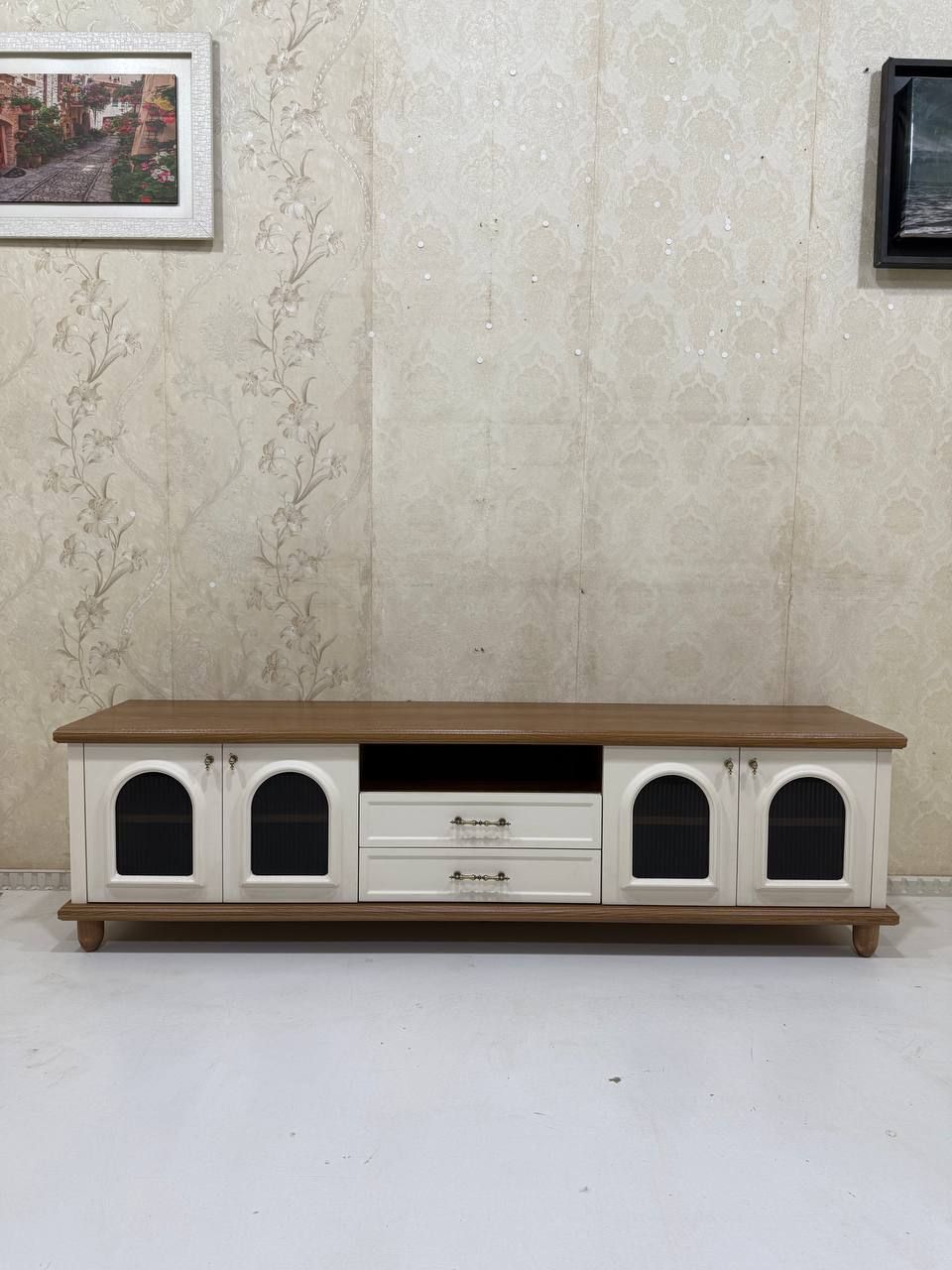 فضای پذیرایی خود را با این میز تلویزیون دو رنگ خاص و چشمنواز متحول کنید. ترکیب صفحه گردویی روشن و دور کرم، جلوهای ماندگار و متفاوت به خانه شما میبخشد.