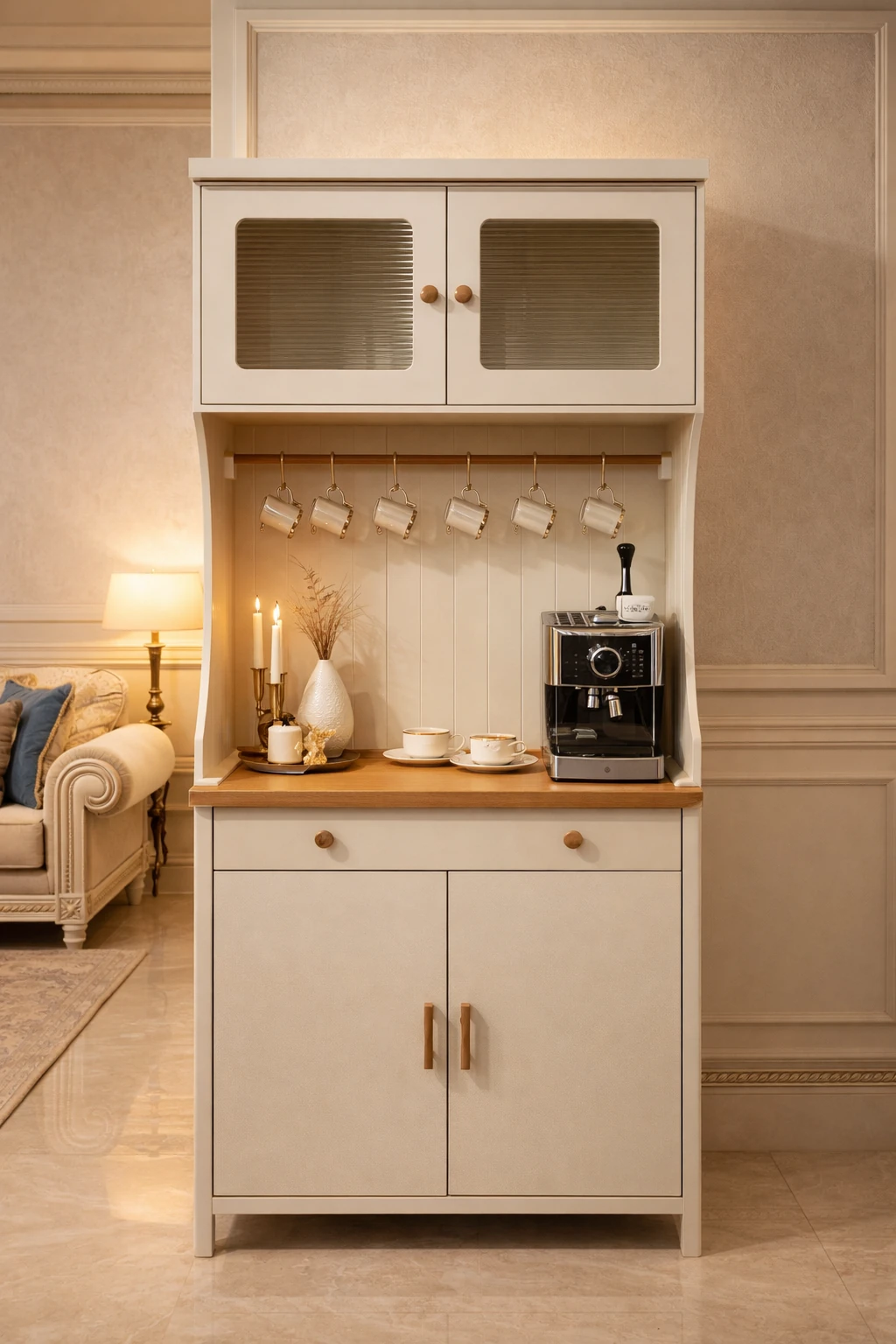 این میز با ترکیب رنگ کرم روشن و صفحه چوبی طبیعی، به‌راحتی با فضاهای نئوکلاسیک، مدرن و حتی مینیمال هماهنگ می‌شود و می‌تواند به‌عنوان کافی‌بار خانگی، بوفه جمع‌وجور یا میز پذیرایی خاص مورد استفاده قرار گیرد.