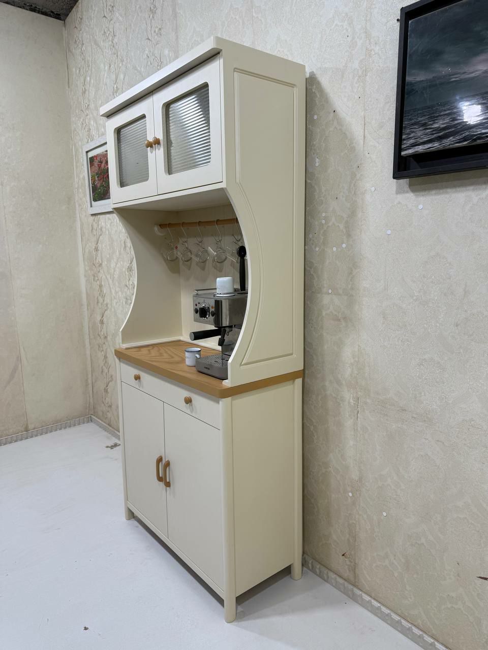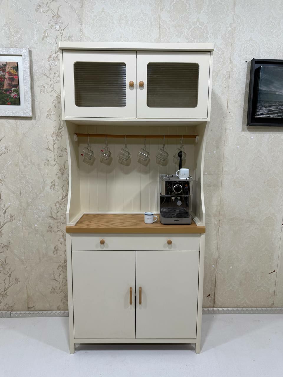وجود قفسه بالایی با درب شیشه‌مات، علاوه بر زیبایی بصری، به مرتب‌ماندن فضا کمک کرده و جلوه‌ای ویترینی به محصول می‌دهد.