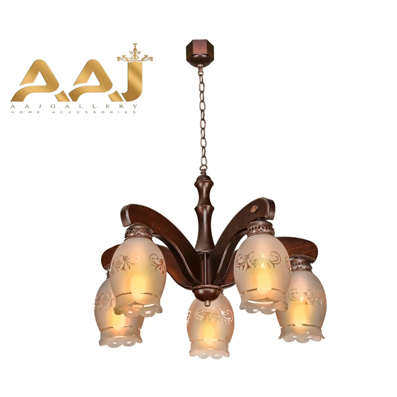 لوستر چوبی افسون 5 شعله از مدل های جدید و خاص کارهای چوبی است که از نظر شکل بدنه و طراحی شاخه ها کاملا متفاوت نسبت به دیگر کارهای چوبی می باشد و دلیل این تفاوت طراحی خاص و خلاقانه بدنه و شاخه ها و برش های ظریف و فوق العاده تمیز و دقیق لوستر به وسیله دستگاه سی ان سی لیزری میباشد که شکل و شمایل جدید و منحصر به فردی به کار بخشیده است.جنس چوب این محصول از چوب درجه یک روس بوده و حباب های آن از سری حباب های جدید و انحصاری است که کرم رنگ بوده و نور را کاملا از خود عبور می دهد.که برای ست شدن محیط هایی مانند آشپزخانه و اتاق خواب ها میتوان از آنها در کنار لوستر بهره برد.