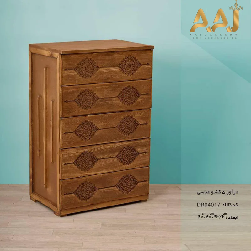 امروزه دراورها یکی از اجزاء اساسی و عضو جدایی ناپذیر اتاق خوابها هستند. دراورها وظیفه مرتب سازی و طبقه بندی لباسها و دیگر وسایل را دارند. دراور از نظر ظاهری صرفا شامل کشوهای متعددی است که به صورت افقی و با استفاده از ریل جا به جا میشوند. اما در مدل عباسی علاوه بر کاراییه یک دراور 5 کشو زیبایی خاصی که در طراحی این محصول به کار رفته بسیار چشمگیر است و زیبایی فضا را دو چندان می کند .