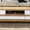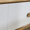 روکش این میز از بلوط سفید است که در ترکیب با دربهای سفیدرنگ، جلوهای مدرن و شیک ایجاد کرده است. رنگ چوب روکش بلوط عسلی بوده که به دلیل طبیعی و خاص بودن، جلوهای منحصربهفرد به محصول داده است. پایههای این میز از چوب روسی درجه یک ساخته شده که علاوه بر استحکام بالا، زیبایی خاصی به طراحی کلی آن بخشیده است.